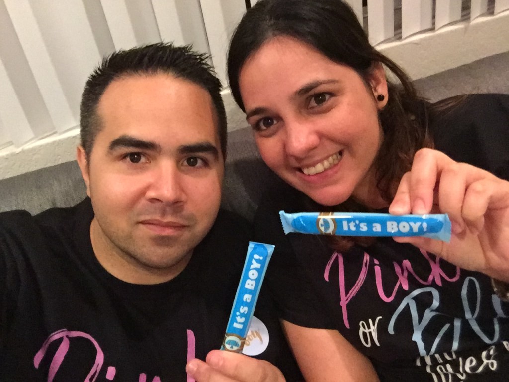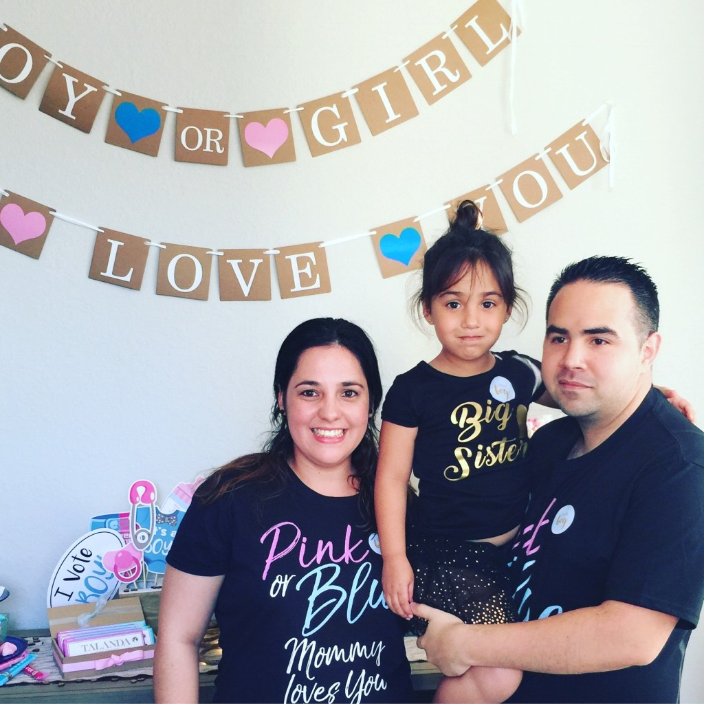 Esas fotos fueron del día de la revelación del género de nuestro segundo hijo. Nuestras camisas decían: Pink or Blue. we love you (Rosa o Azul, nosotros te amamos)